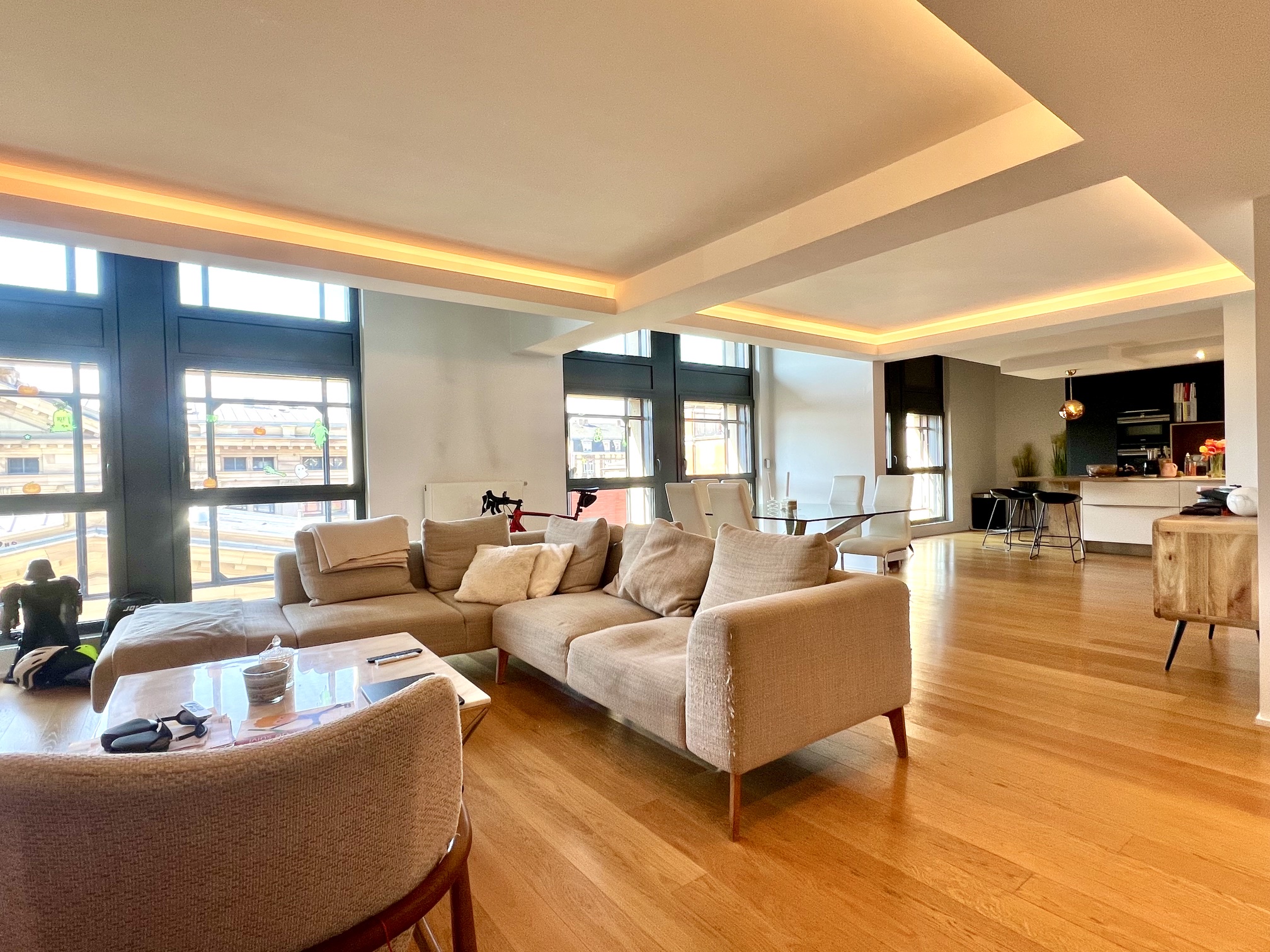 Dans immeuble historique en pierre de taille, très bel appartement 4/5 pièces duplex, situé au 4 étage avec ascenseur. Comprenant : une entrée sur un vaste séjour double et cuisine équipée ouverte. Un cellier et un wc visiteurs. 0 l'étage, 2 chambres d'enfants avec placards, une salle de douche et un wc. Une suite parentale avec salle de bains (baignoire, douhce et wc) ainsi qu'un dressing et un débarras. Très belles prestations, appartement climatisé. Chauffage collectif au gaz. En annexe : un parking privatif au sous-sol. Prix du bien net vendeur 966 000 € Frais d'agence inclus (920 000 € net vendeur + 46 000 € de frais d'agence à la charge de l'aqcuéreur)